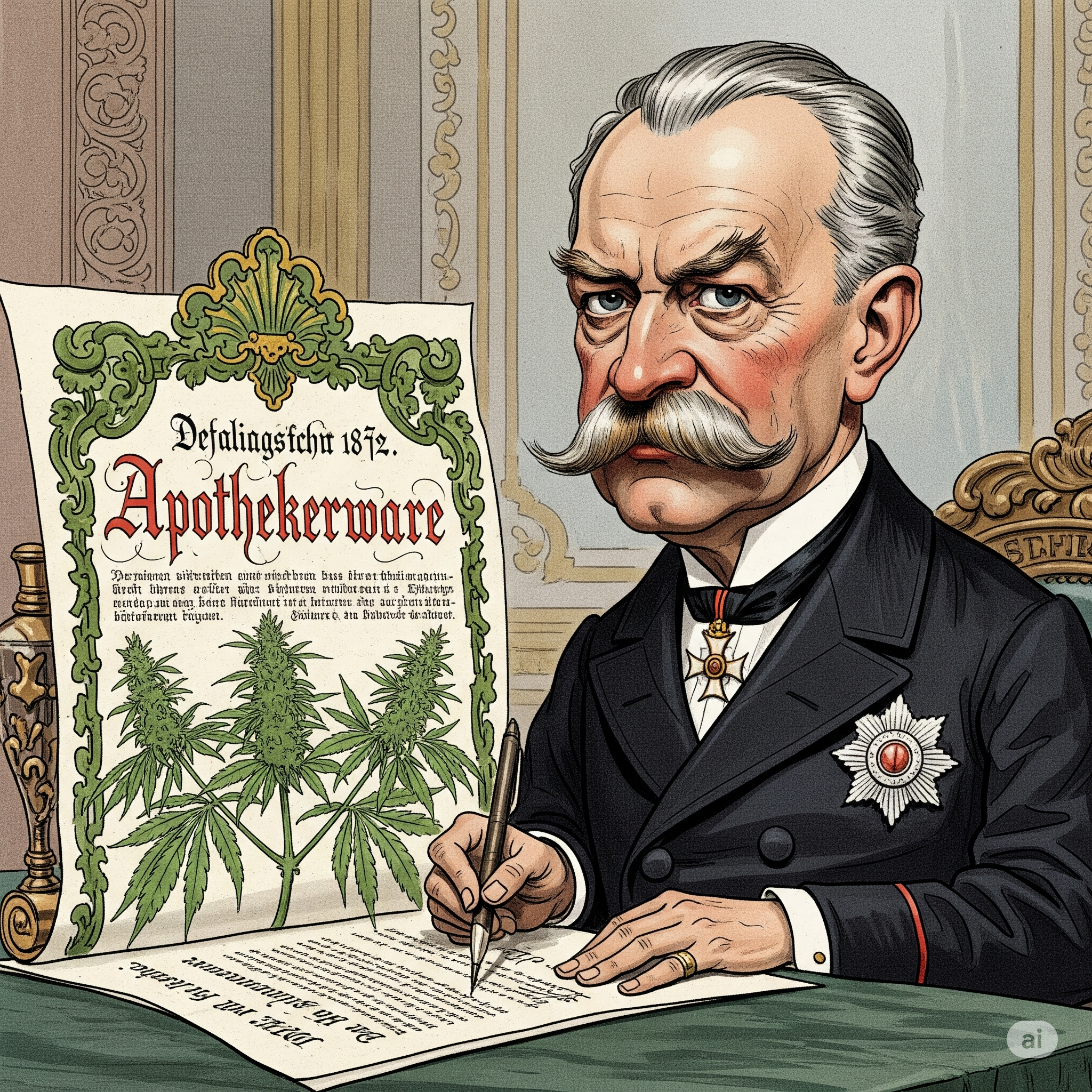• 1872: Kaiser Wilhelm I. erlässt eine Verordnung, die Cannabis offiziell als „Apothekerware“ einstuft und den Verkehr regelt.