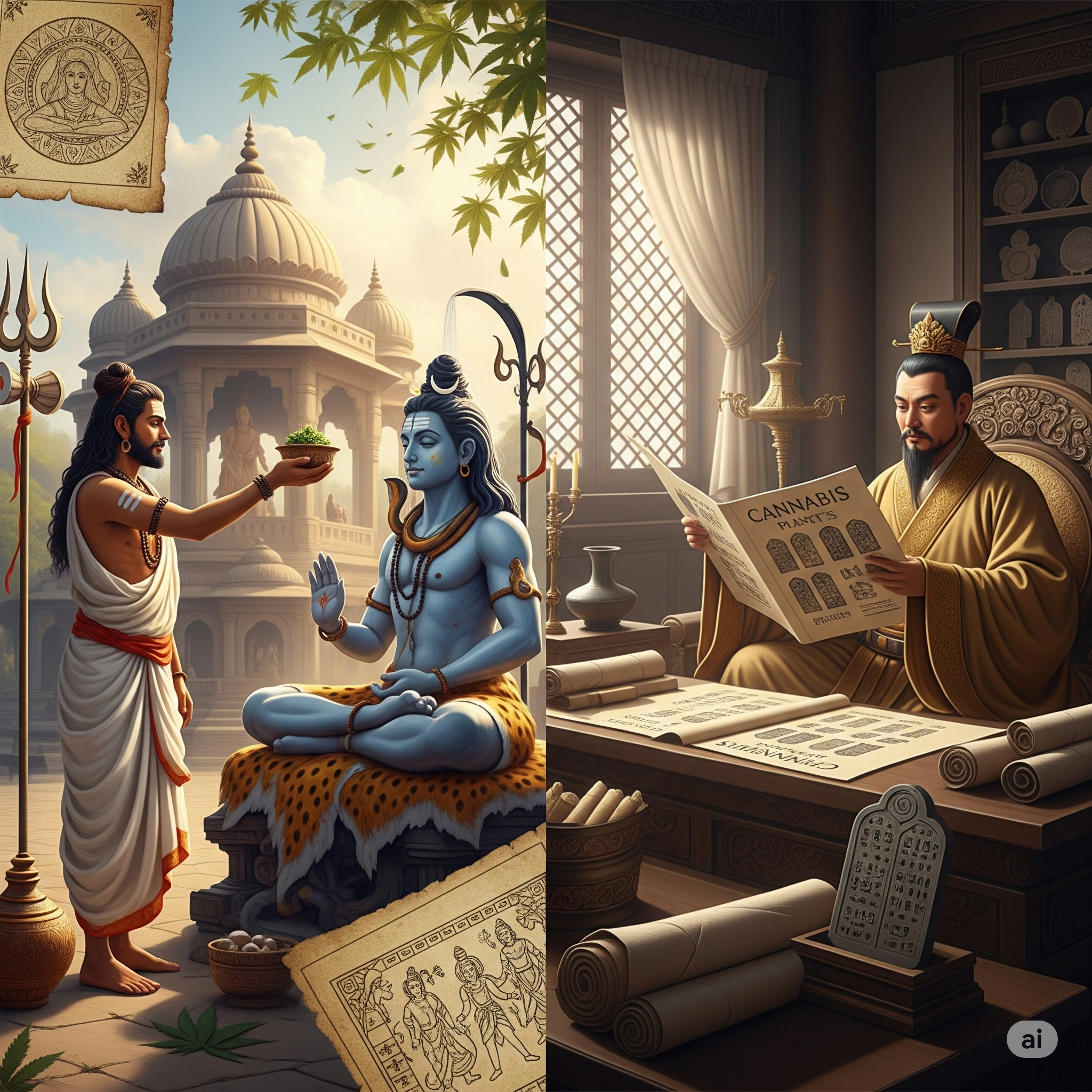 Darstellung links: Gott Shiva bekommt Opfergaben; rechts: Kaiser Shen beschäftigt sich mit Cannabis