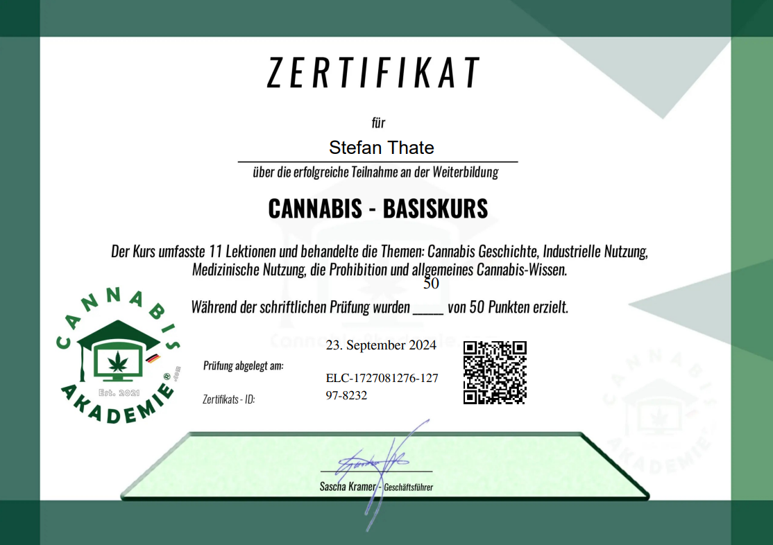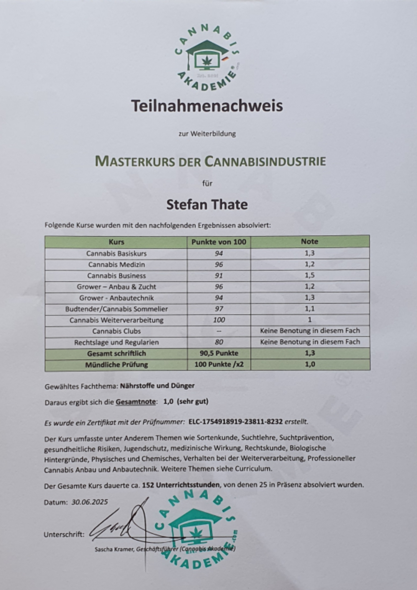 Ich komme ursprünglich aus dem Handwerk. Als gelernter Werkzeugmechaniker (Formentechnik) wurde mir die Liebe zum Detail und zur Präzision quasi in die Wiege gelegt. Diese Genauigkeit ist heute mein wichtigstes Werkzeug im Garten. Um mein praktisches Wissen auch wissenschaftlich zu untermauern, habe ich an der Cannabis-Akademie am Masterkurs teilgenommen und diesen mit Summa Cum Laude abgeschlossen. Heute freue ich mich, dort als Aushilfsdozent mein Wissen weitergeben zu dürfen.